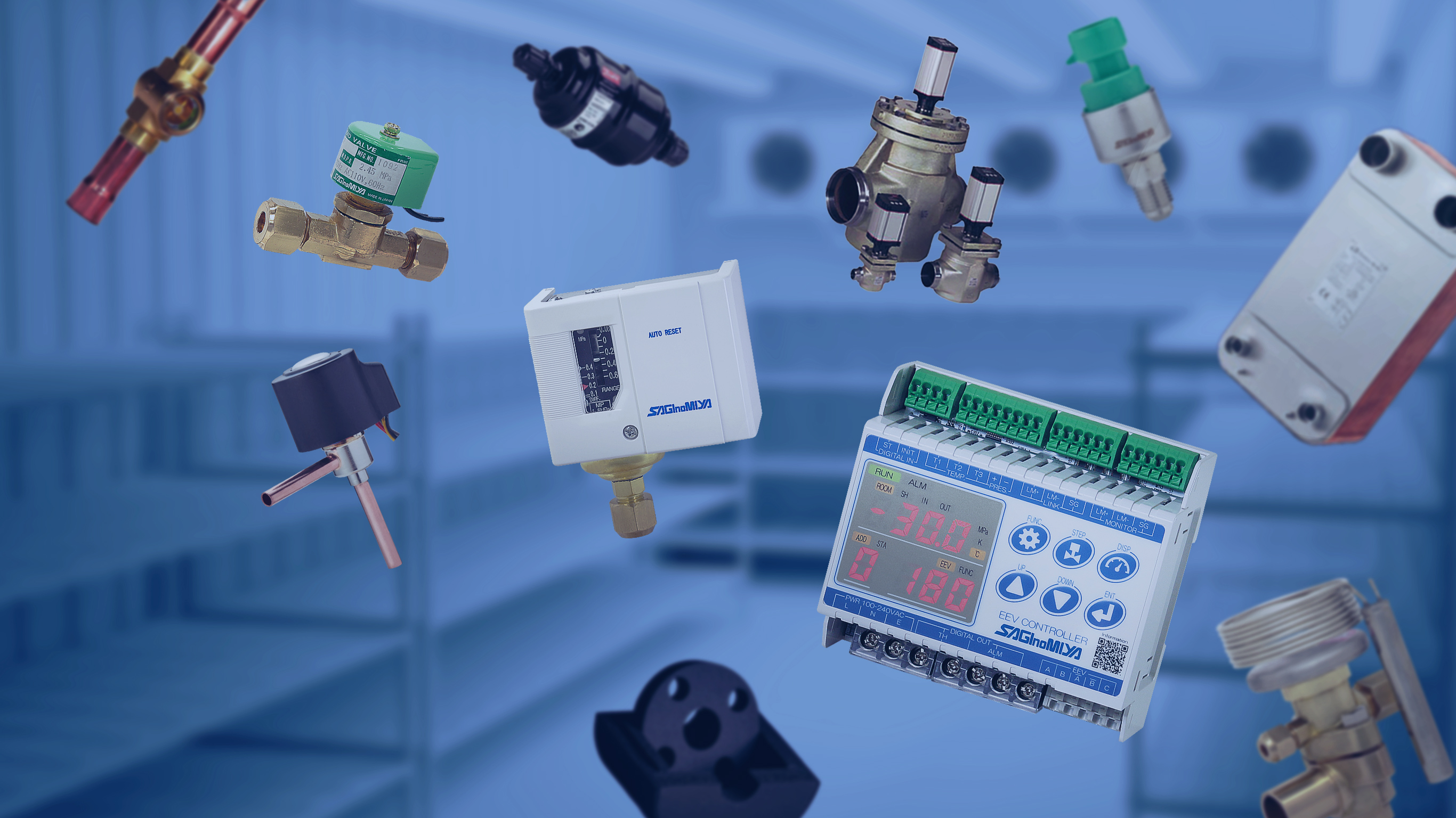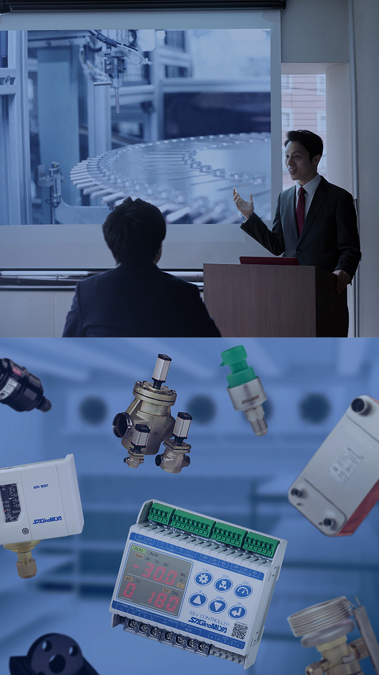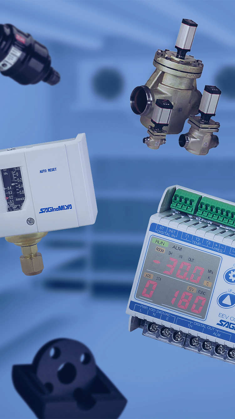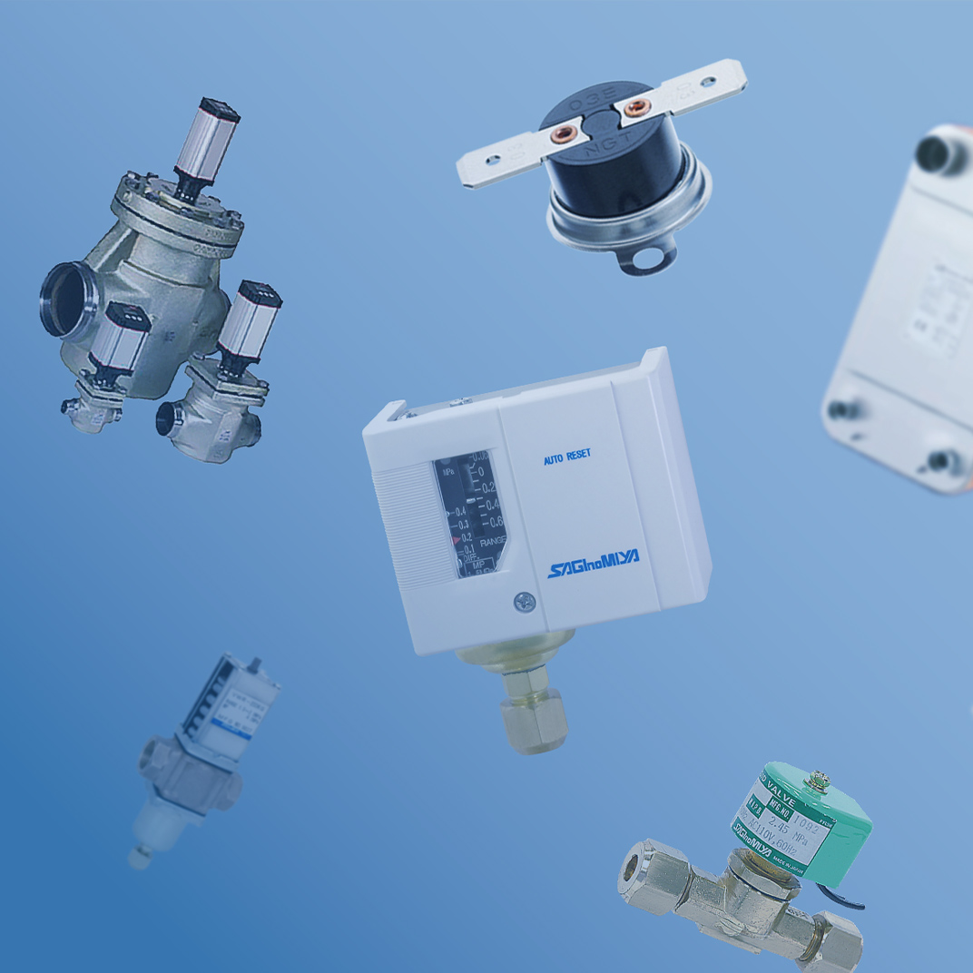 サギノミヤ製品をはじめ、ダンフォス製品、各種関連装置及び部材を取り揃え、冷凍‧冷蔵‧暖房・空調などの冷熱分野を中⼼とした各種製造‧設備⼯事‧管⼯事に従事されるお客様へ必要なものを⼀括でご提供することができます。